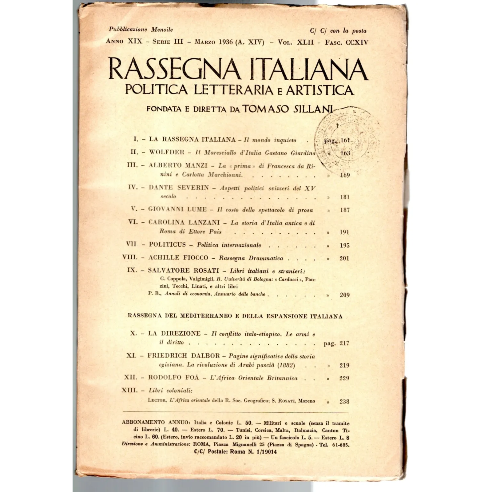 RASSEGNA ITALIANA. POLITICA LETTERARIA-vol XLII, fasc CCXIV, marzo-1936
